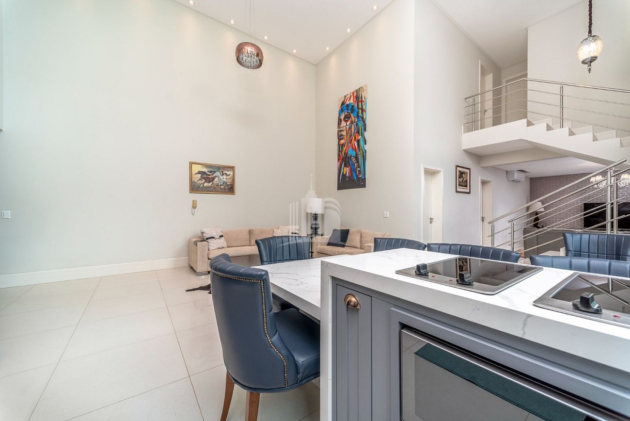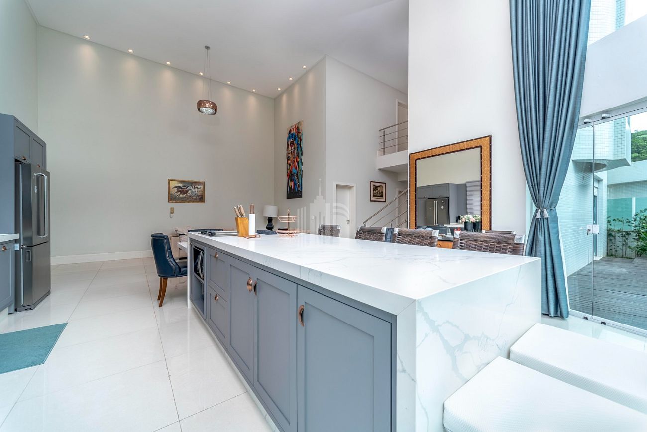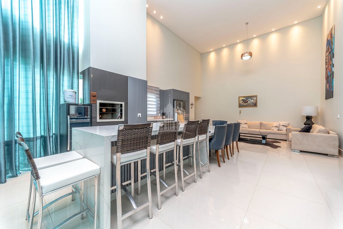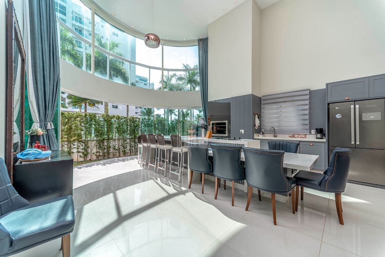 - Cozinha americana com pé direito duplo e churrasqueira a carvão