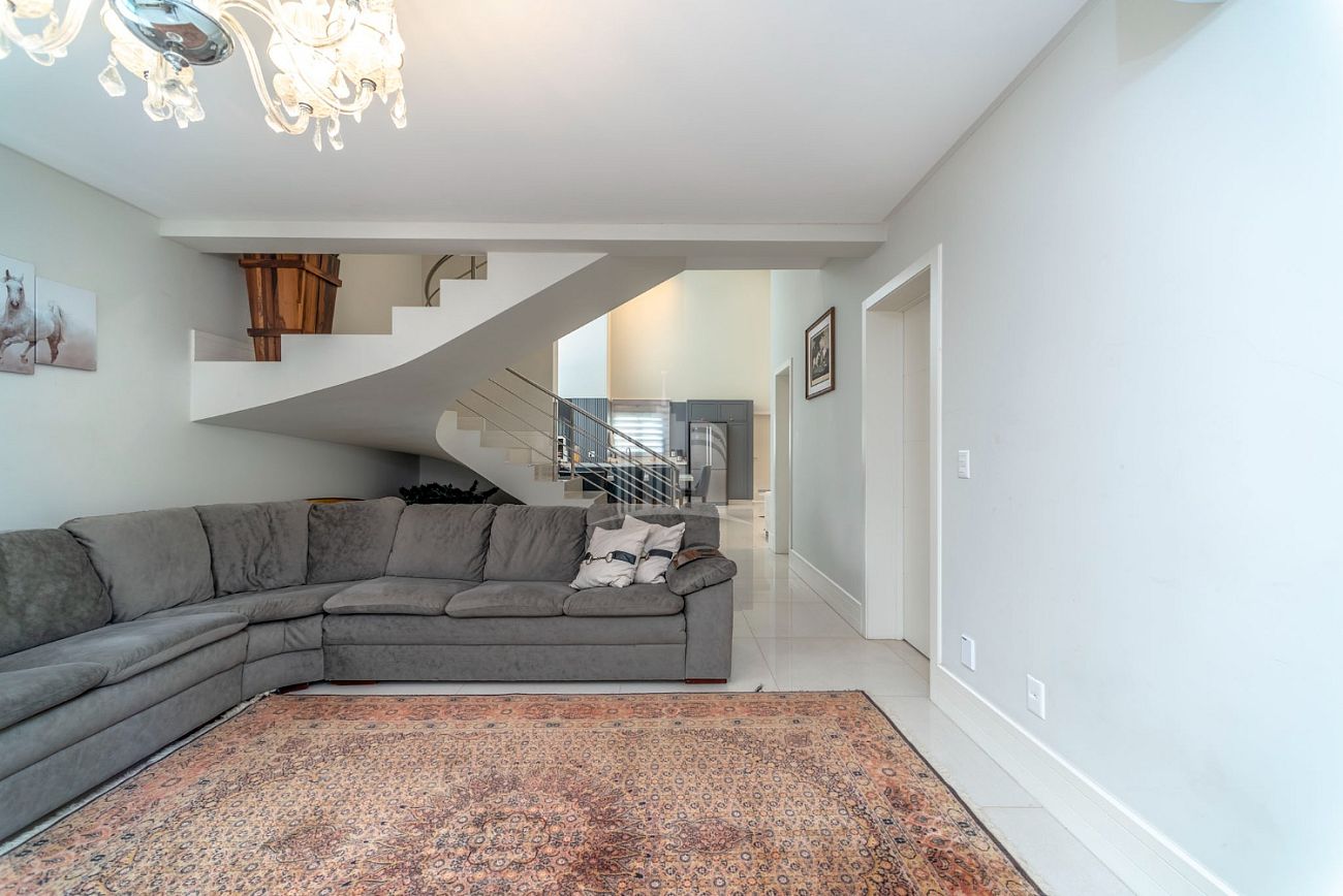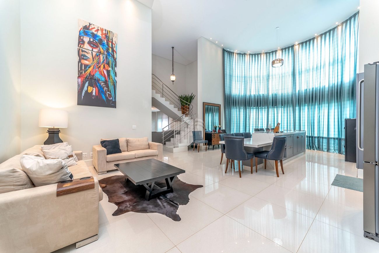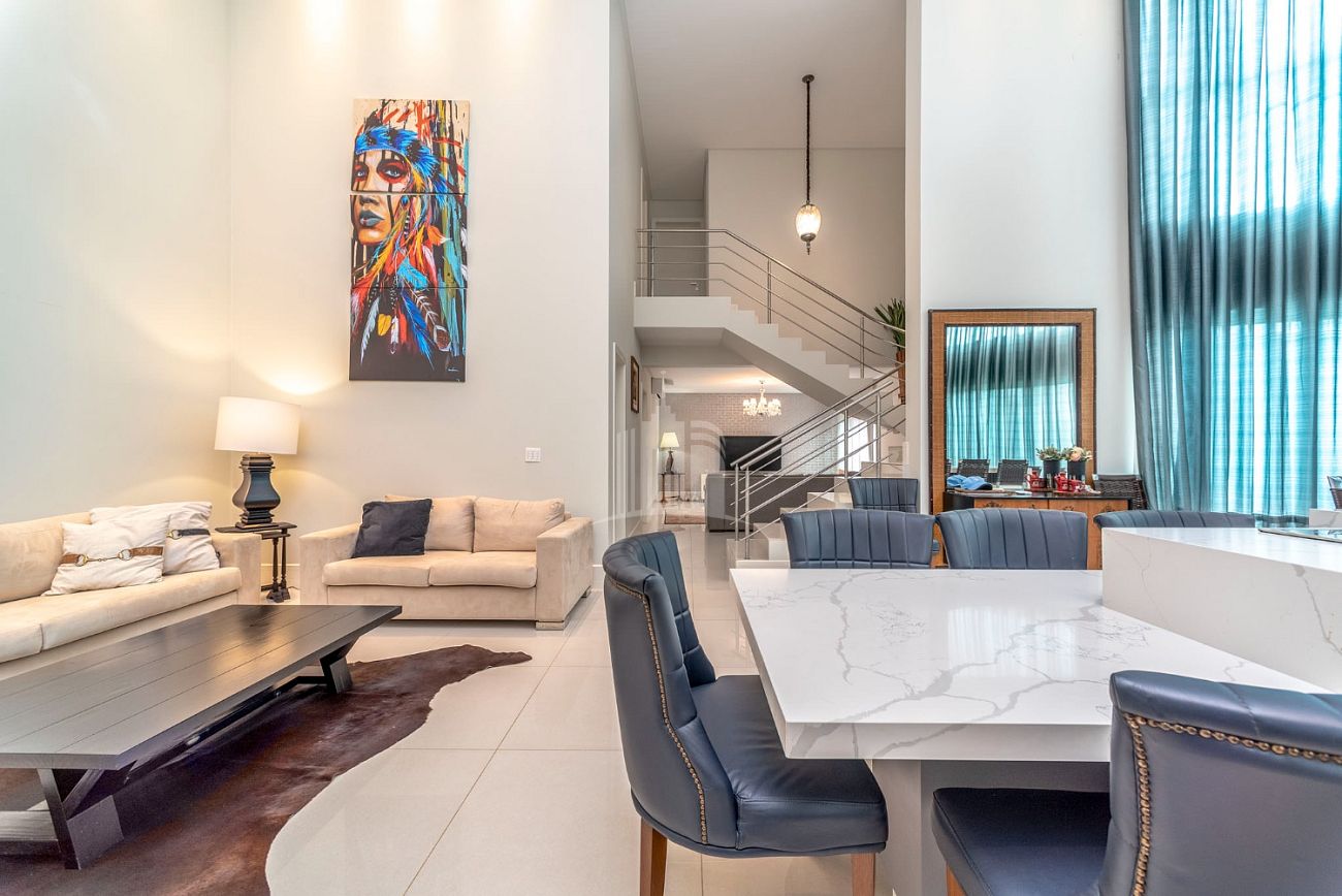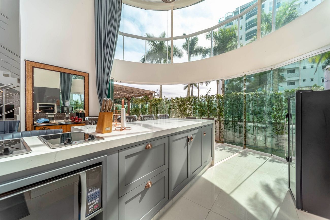 - Cozinha americana com pé direito duplo e churrasqueira a carvão