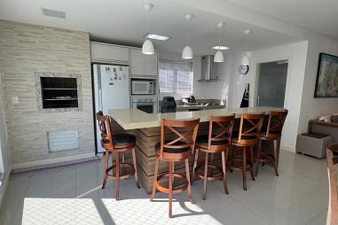 Os dormitórios são aconchegantes destacando-se uma suíte privativa, além de duas demi-suítes que garantem bem-estar para toda a família. O imóvel conta ainda com um lavabo, ideal para receber visitas. A cozinha, moderna e funcional, foi projetada para otimizar o espaço, e sua proximidade com a área de serviço oferece maior praticidade para o dia a dia.