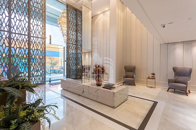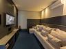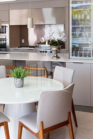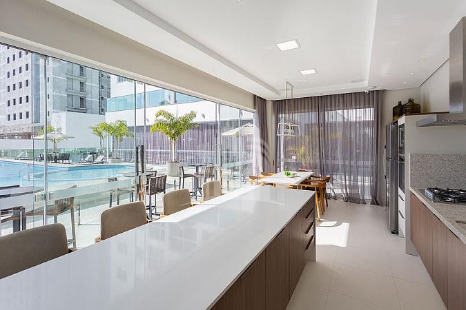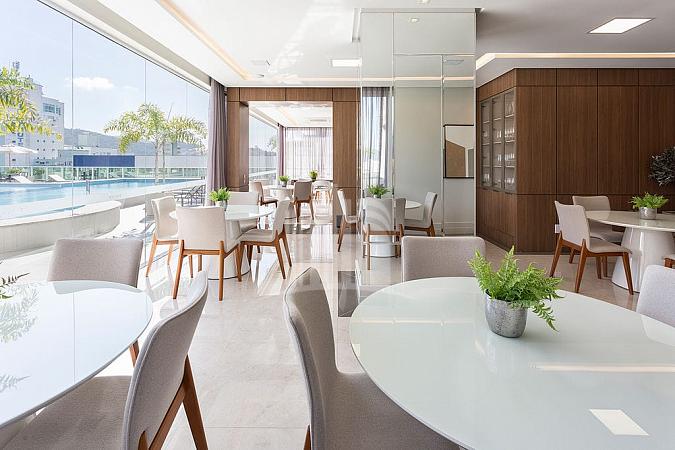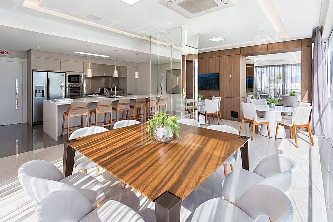 Ambientes amplos, integrados, com living composto por sala de estar, sala de jantar, cozinha em conceito aberto com bancada e espaço gourmet com churrasqueira. Finamente mobiliado, com decoração sofisticada e acolhedora em tons neutros, excelente ventilação e incidência de luz natural.
